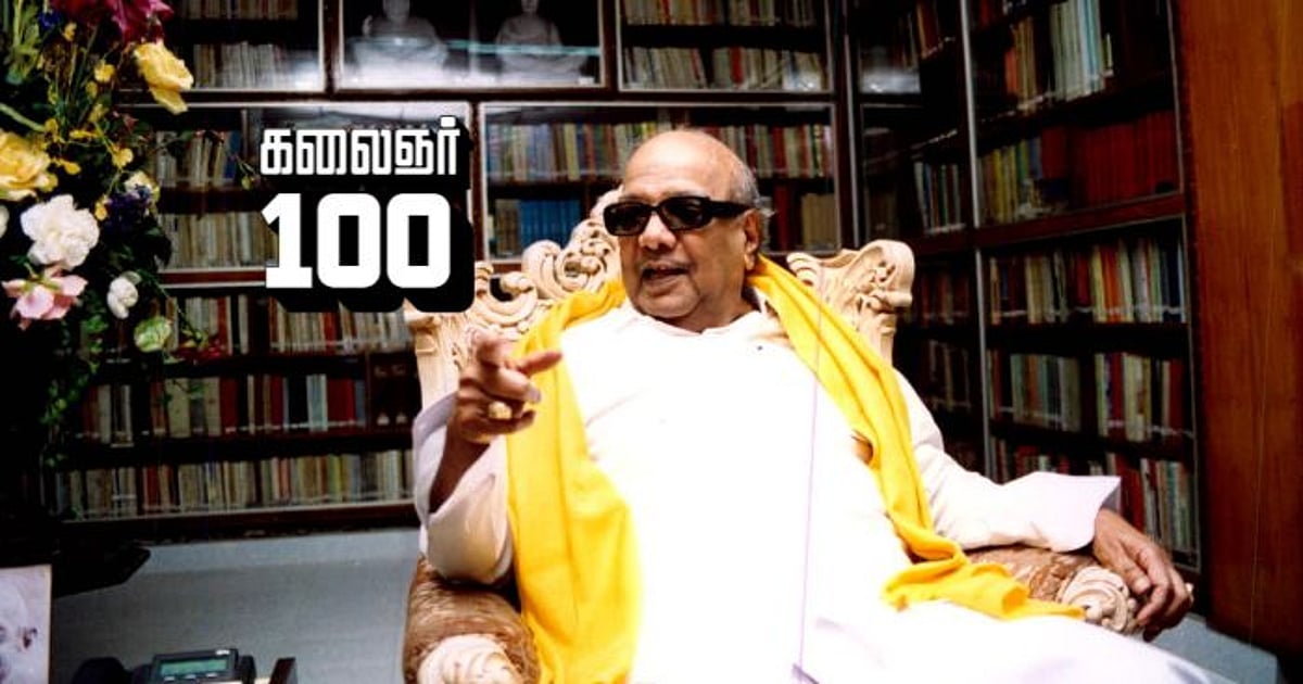 1930-களின் பிற்பகுதியில் திருவாரூரில் பள்ளி மாணவனாக இருந்தபோதே கருணாநிதியின் தமிழ்ப்பணி தொடங்கியது என்கிறார்கள். 1938-ல் ராஜாஜி இந்தியைக் கட்டாயப் பாடமாக்க வேண்டுமென முடிவெடுத்ததை பெரியார், அண்ணாதுரை போன்றோருடன் தமிழறிஞர்கள் பலரும் எதிர்த்தனர். அப்போது, 14 வயது சிறுவனான கருணாநிதி, பள்ளி மாணவர்களுடன் இந்தியை எதிர்த்து, கையில் தமிழ்க்கொடியுடன் திருவாரூர் தெருக்களில் ஊர்வலம் வந்தார். ‘வாருங்கள் எல்லோரும் போருக்குச் சென்றிடுவோம் /வந்திருக்கும் இந்திப் பேயை விரட்டித் திருப்பிடுவோம்’ என அவர் எழுதிய வார்த்தைகள், ஊர்வலத்தில் முழக்கமாக எதிரொலித்தது.