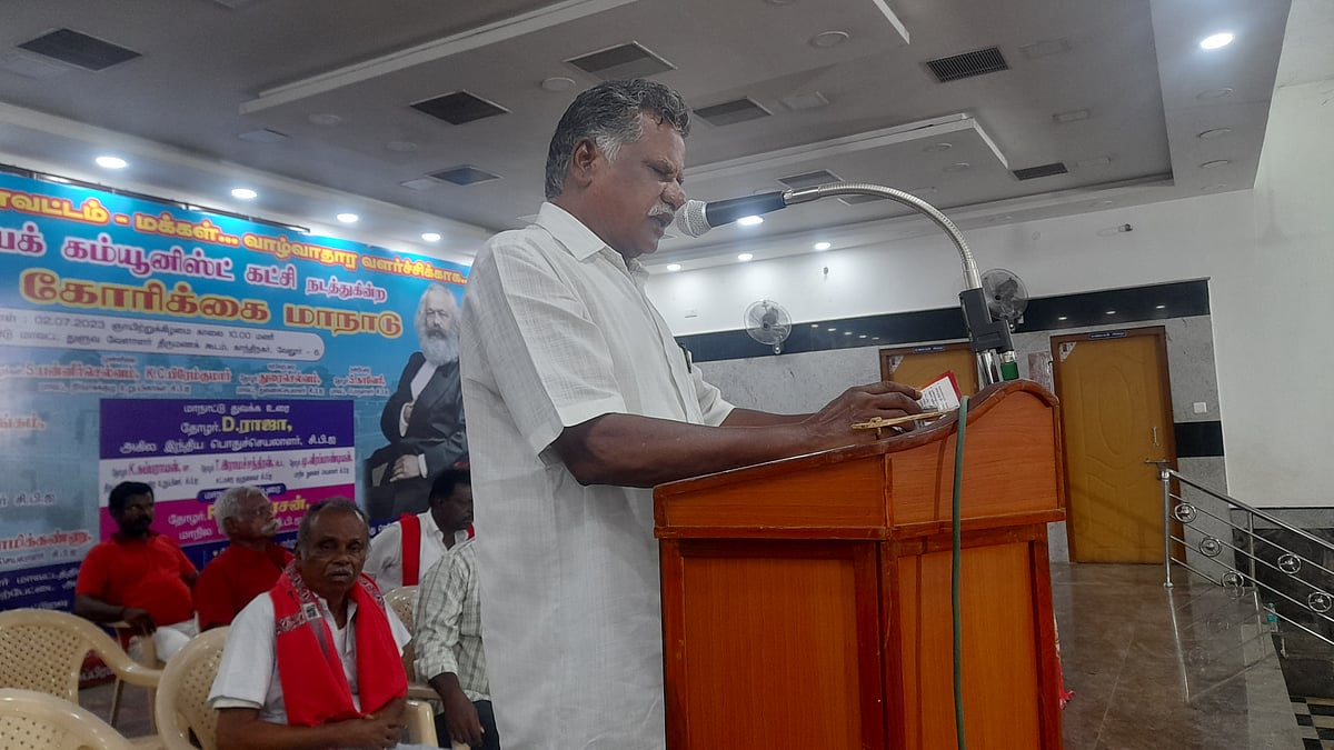 இந்த மாநாட்டுக்கு இந்திய கம்யூனிஸ்ட் கட்சியின் அகில இந்திய பொதுச்செயலாளர் டி.ராஜா பங்கேற்கவிருந்தார். தவிர்க்க முடியாத காரணங்களால் அவரால் பங்கேற்க முடியவில்லை'' என்று முத்தரசன் தெரிவித்தார். உதயநிதி பாணியில் செங்கல்லை கையில் எடுத்த அண்ணாமலை - குமரி சங்கமத்தில் ஆவேசம்!