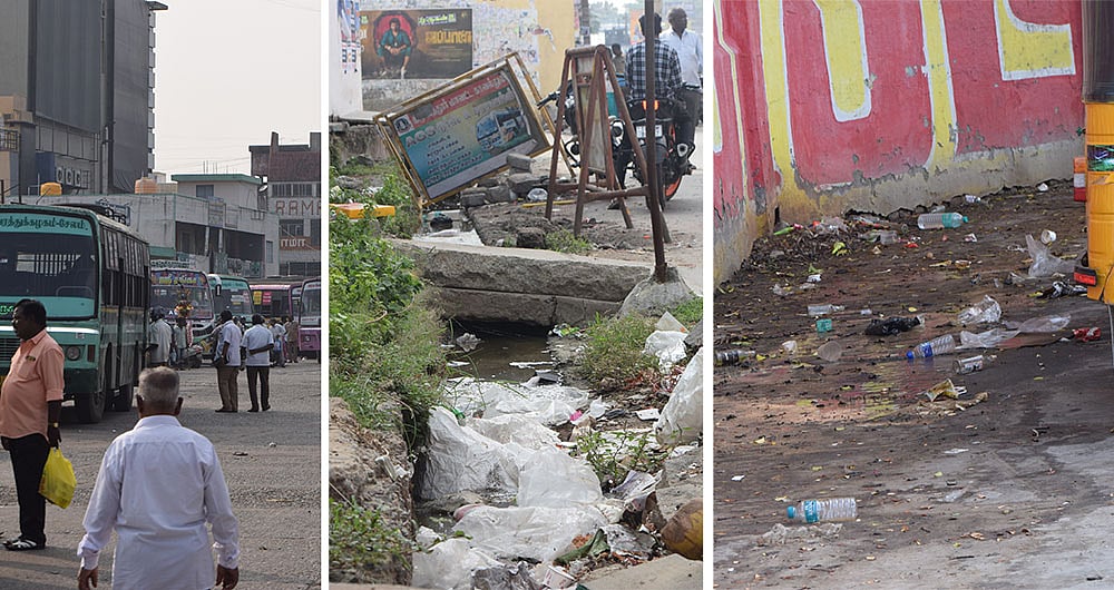 பேருந்து நிலையத்திலிருந்து, பேருந்து வெளியே செல்லும் இடத்தில், நகராட்சி நவீன கட்டணக் கழிப்பிடமும், பேருந்து நிலையத்தில் சிறுநீர் கழிப்பிடமும் இருக்கின்றன. நீண்ட வருடங்களாகவே இந்தச் சிறுநீர் கழிப்பிடத்திலிருந்தும், நகராட்சி நவீன கட்டண கழிப்பிடத்திலிருந்து வரும் கழிவுநீர் கலந்து கால்வாயில் தேங்கிய நிலையில் காணப்படுவதாகவும், அதுவும் திறந்தநிலையிலே கிடப்பதாகவும் சொல்கிறார்கள். மேலும், மது அருந்திவிட்டு மது பாட்டில்களைப் பேருந்து நிலையத்தின் ஓரங்களில் போட்டுவிட்டுச் சென்றுவிடுவதாகவும் பொதுமக்கள் மற்றும் பேருந்து ஓட்டுநர்கள் வேதனை தெரிவித்தனர்.