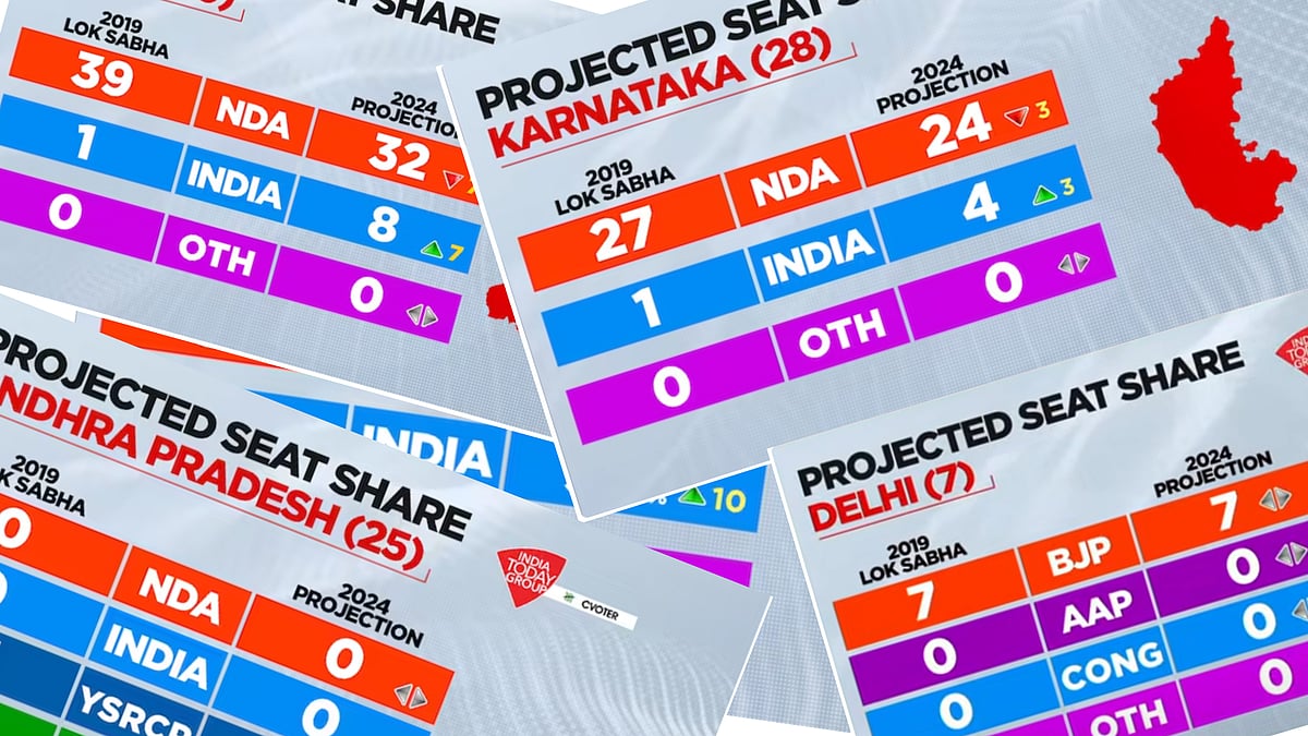 கர்நாடகாவில் இருக்கும் 28 மக்களவைத் தொகுதிகளில் NDA கூட்டணி 24 இடங்களிலும், INDIA கூட்டணி 4 இடங்களிலும் வெற்றி பெறலாம்.
