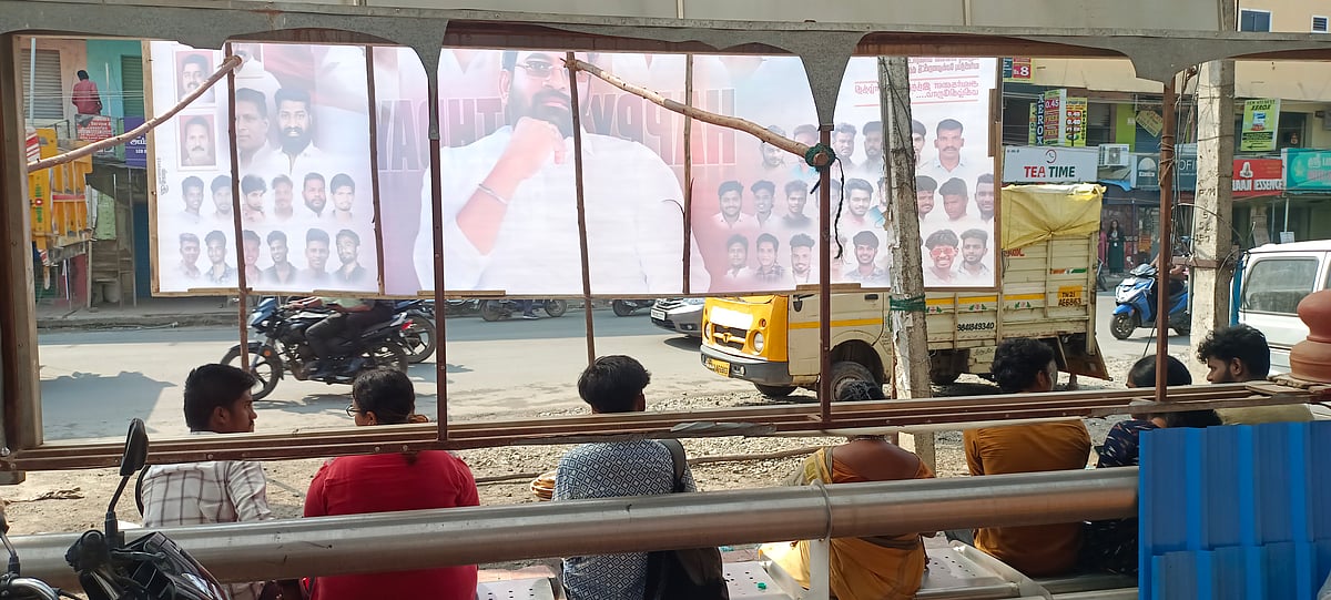 இதன் காரணமாக பயணிகள் பெரும் சிரமத்துக்குள்ளாகின்றனர். இது தொடர்பாக நம்மிடம் பேசிய அங்கிருந்த பயணிகள், ``இங்கு நிற்பதே ஒரேயொரு பேருந்து மட்டும்தான். ஆனால், இவ்வளவு பெரிய பேனரை இங்கு வைத்துவிட்டு, அந்தப் பேருந்தும் இங்கு நிற்காதபடி சூழலை ஏற்படுத்துகின்றனர். வெயிலின் தாக்கம் அதிகமாக இருப்பதால், பேருந்து நிறுத்த இருக்கையில் சென்று அமர்ந்தால், பேருந்து வருவதே தெரியவில்லை. பேருந்து நிறுத்தத்தில் பேனர்
